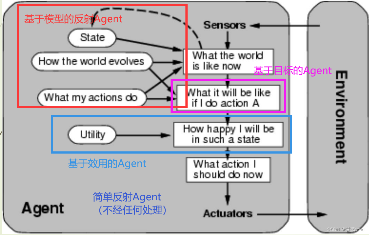 • 基于效用的Agent:当达到目标的行为有多种时,基于效用进行决策