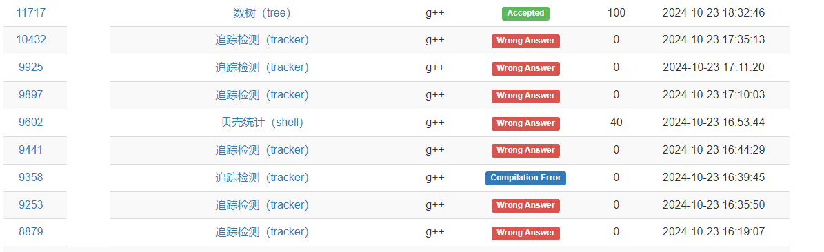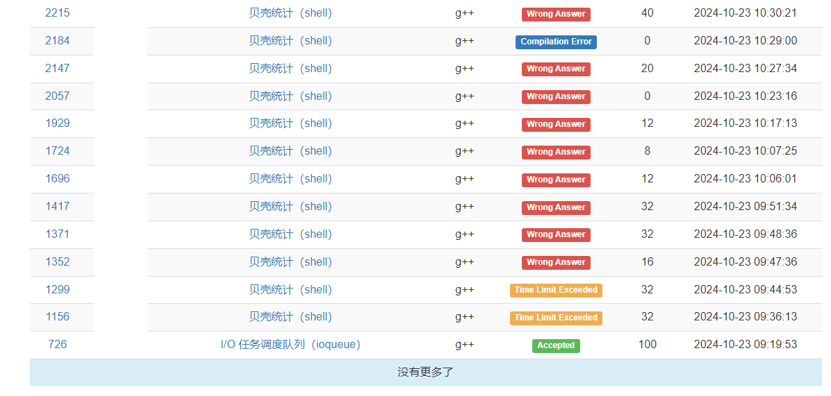 临结束的时候交了一发贝壳统计,换了一种思路,当时没立刻出结果,后来看到还是TLE,那就没办法了,就这样吧。事后发现,如果这个拿满,还是可能银牌的,呵呵。