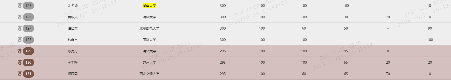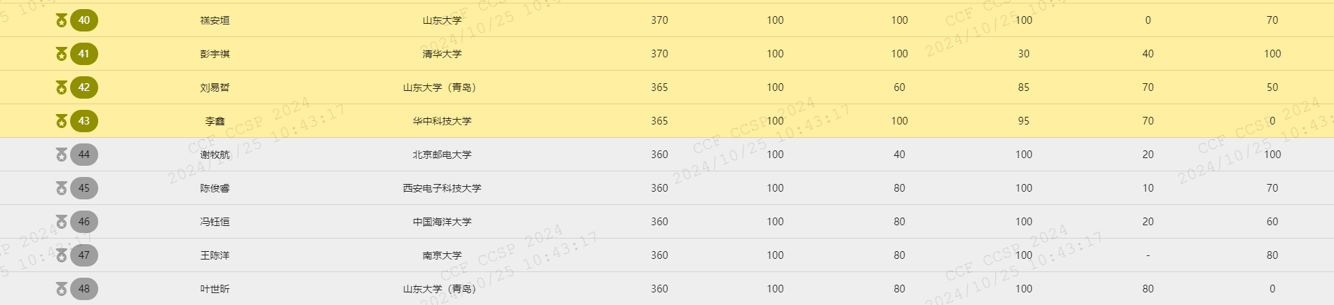 饭后敲了半个小时,直接提交,数树AC了,此时已经六点半了,我AC了第二道题。这45分一加,效果很显著,直接跳到了铜奖中间的位置,240分。